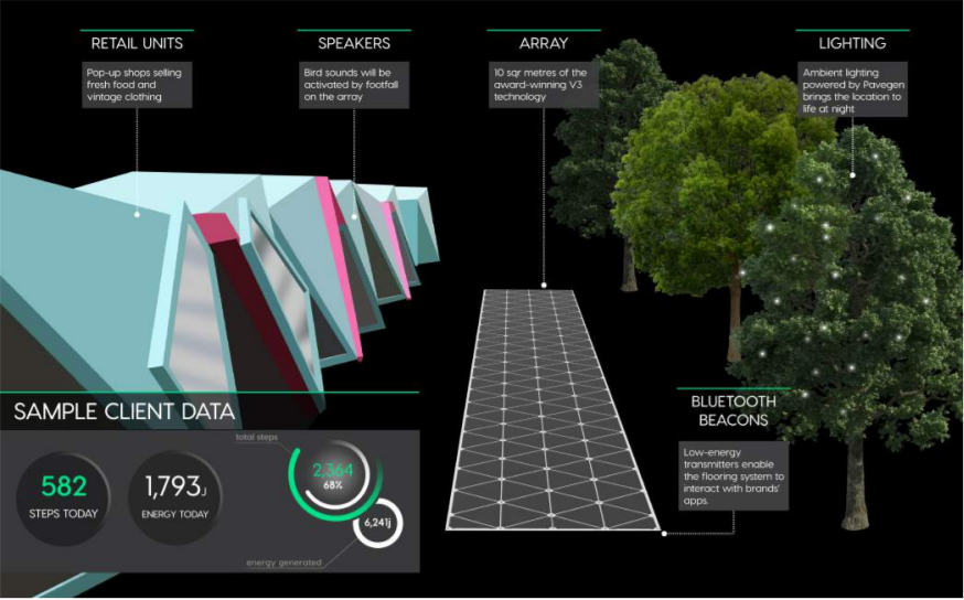 O sistema tem também outro objetivo além de gerar energia. Cada módulo de piso do sistema é equipado com um transmissor de dados Bluetooth, que captura informações a partir de cada passo. Ao caminhar, o pedestre pode se conectar a um aplicativo móvel da empresa onde cada passo coletado é convertido em moeda digital que pode tanto ser usada como recompensas em programas de fidelidade, como doadas para instituições de caridade.